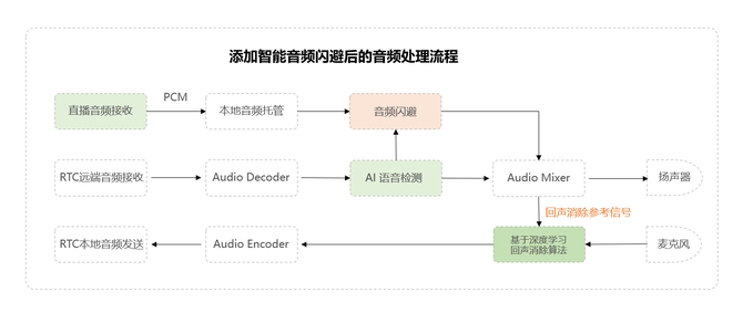 边看边聊场景添加智能音频闪避后的音频处理流程如图: