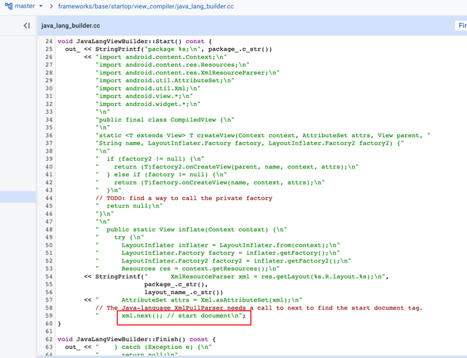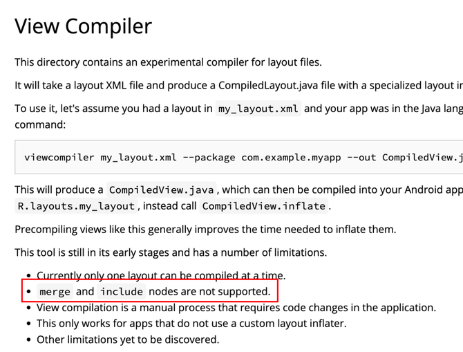 我们的探索灵感来自于 ViewCompiler 。作为 Google 的一个实验性工具,ViewCompiler 可以手动地将 xml 布局转化为 java 文件或者 dex 文件,但它并不支持 merge 和 include 标签。