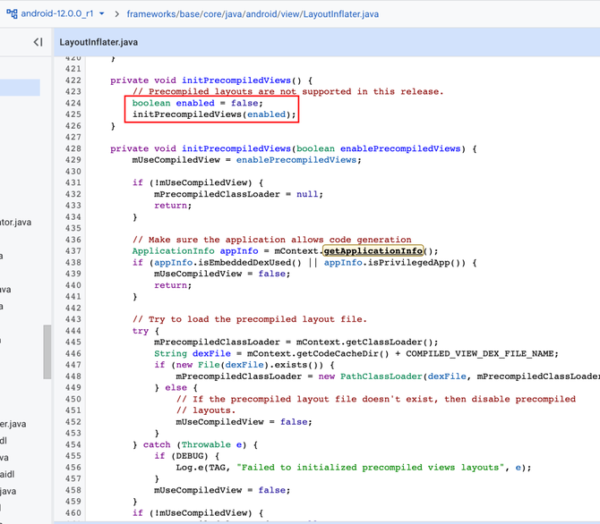 ViewCompiler 在 Android Q(Android 10)的时候被引入,目前来说也还是一个实验性质的工具,因此我们平时并没有办法使用它。下图为Android S(Android 12)中的源码,大家可以看到这项功能未被开启。