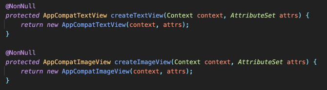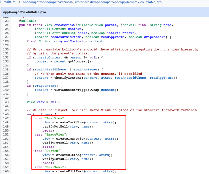 AppCompat 基础组件可以查看 AppCompatViewInflater.java 源码(上文也有部分展示),其中包括了诸如 TextView、Button 等十几个常用的基础组件。