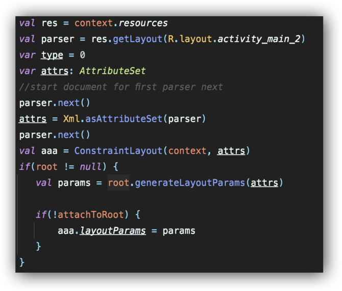基于对 X2C 和 ViewCompiler 的源码和生成代码的阅读,我们决定做一个可以生成 Kotlin 代码,同时也解决 ViewCompiler 不支持的 include 和 merge 两个标签。我们用到的工具比较常规,有 kapt 和 kotlinpoet,整体的思路是通过 Resources.getLayout 取到 XmlResourceParser,然后通过 parser 的不断 next 来遍历每一个 xml 中的 tag,生成的代码示意如下: