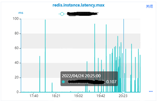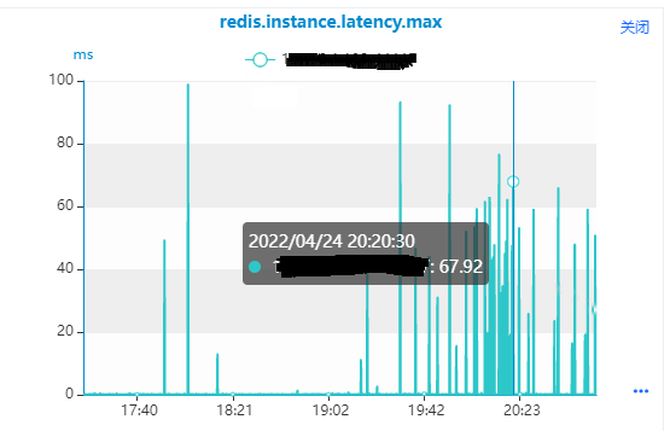 1.使用Daas平台“服务监控-数据库实例监控”,选择master节点,选择Redis响应时间监控指标“redis.instance.latency.max”,如下图所示,从监控图中我们可以看到