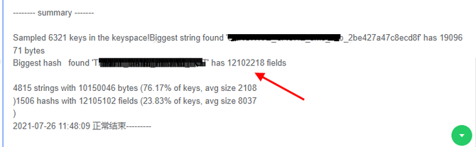 2. 经过分析找出了hash类型的Bigkey有8421874个fields,正是这个Bigkey导致迁移时间太长,超过了迁移时间限制,导致工单失败了。