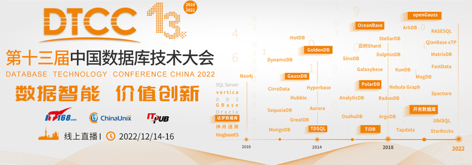 2022年12月14日~16日,由IT168联合旗下ITPUB、ChinaUnix两大技术社区主办的第十三届中国数据库技术大会(DTCC2022)在线上隆重召开。