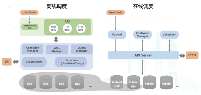 在离线资源共池,Quota 管控、调度、运行、机器运维统一。
