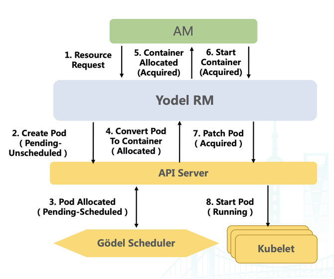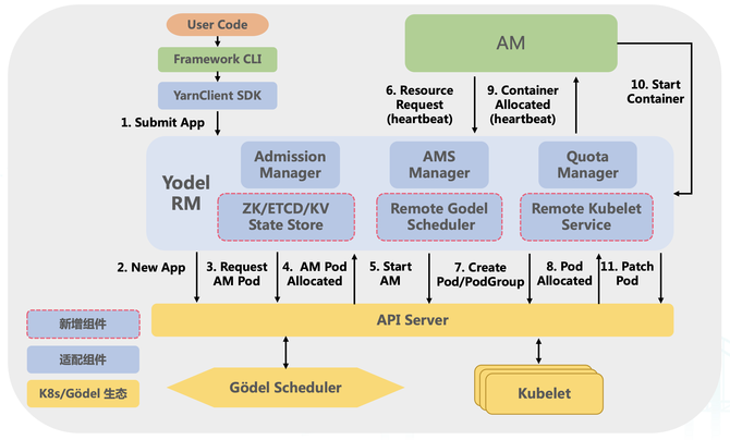 Yodel 基于 YARN 实现,新增 ZK / ETCD / KV State Store、Remote Godel Scheduler 、Remote Kubelet Service 服务。ZK / ETCD / KV State Store 主要用于持久化存储、Remote Godel Scheduler 维护资源请求并与 API Server 交互,将调度能力统一到 Godel Scheduler;Remote Kubelet Service 实现了 YARN NM 所有接口,对用户和作业透明的前提下,把 NM 的 Container 管理能力平滑下沉到 Kubelet。