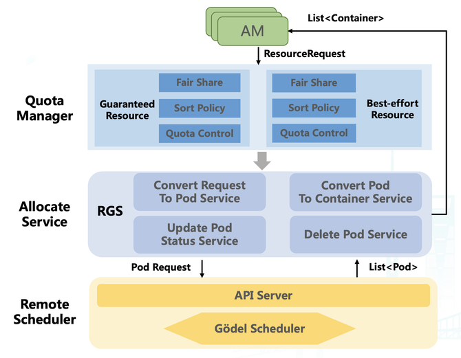Remote Godel Scheduler:维护集群所有任务的资源请求,通过该服务将任务的资源请求转化为 Pod 写入 API Server,同时与 API Server 交互获取已调度的 Pod,最终将调度能力下沉到底层的 Godel Scheduler;