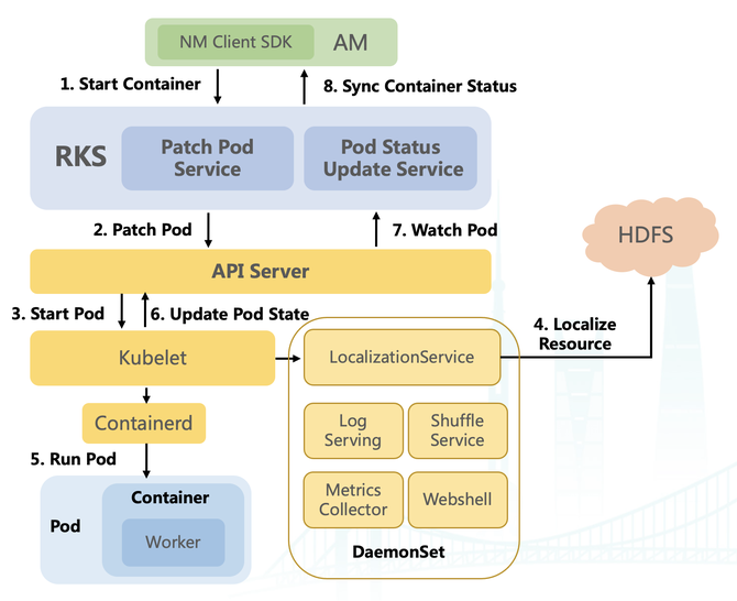 Pod Status Update Service : 该服务会及时从 API Server Watch Pod 的最新状态,并将状态返回给对应 AM。