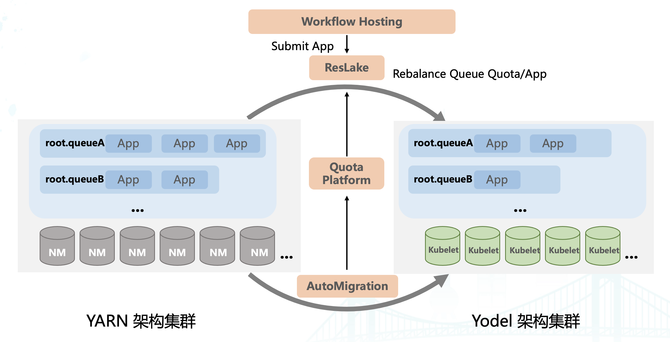 ResLake 在 YARN 集群和 Yodel 集群上有同名的队列,如上图中的 root.queueA 和 root.queueB,这两个集群上的队列有着相同的元数据信息。AutoMigration 服务会不断地从 YARN 搬迁节点到 Yodel 集群,搬迁信息会同步给 Quota Platform,Quota Platform 会进一步将队列 Quota 信息同步给 Reslake。作业托管平台提交作业到 ResLake 时,ResLake 会根据 YARN/Yodel 上队列的 Quota 信息,决定作业是提交到 YARN 集群还是 Yodel 集群。随着机器不断地往 Yodel 搬迁,最终作业也平滑迁移到了 Yodel 集群上。