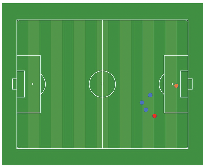 这项任务需要将球员位置从2D图片中投影到球场的俯视平面上。具体来说我们首先选取几个关键点,球场禁区线的四个点,中场线的点,然后就可以构造仿射变换矩阵。在我们从图像中得到球员的坐标后,就可以利用仿射变换矩阵将球员坐标变换到球场平面上了。