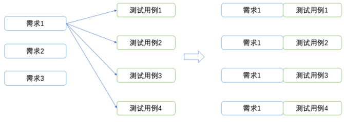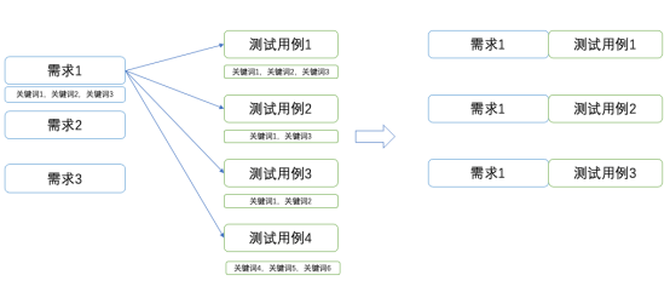 为此,我们设计了关键词关联法,在不增加工作量的基础上,加强需求与测试用例的关联关系。该方法通过将需求和测试用例拆分为关键词词组,若需求关键词词组与用例关键词词组存在交集,则认为两者存在关联。这也是一种非常直观的方法,即需求对应的业务与测试用例对应的业务如果相同,那么两者之间有较大概率存在关联,反之亦然。