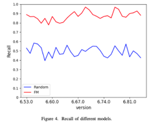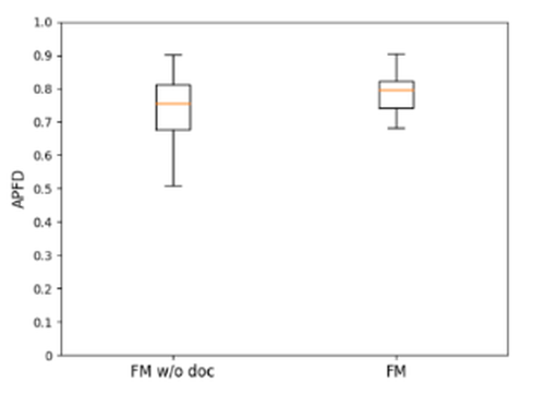 问题1的实验结果如上图。APFD的箱型图显示,采用FM算法后,发现BUG的时机相比随机结果提前了非常多,这表明我们的整体方法是有效的。同时,我们使用Recall_{0.5} 来观察BUG的遗漏情况,可以看到在使用一半的测试用例的情况下,平均召回率可以达到90%,即只有10%左右的BUG会遗漏。