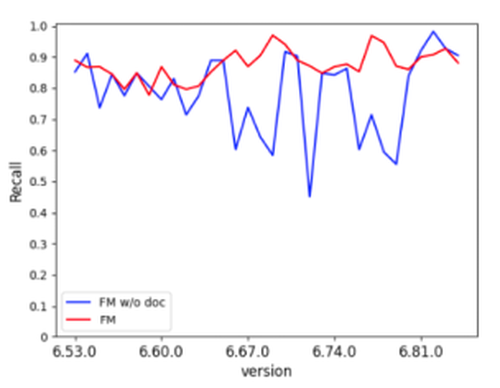 问题2的实验结果如上图。从APFD箱型图我们可以看到,尽管使用需求数据与不使用需求数据的APFD在均值上相差仅4~5个百分点,但不使用需求数据的APFD分布更加分散,即仅使用测试用例的情况下,预测BUG的效果并不稳定,并不能稳定将BUG的发现时机提前。再看召回率图则更加明显,仅使用测试用例的模型,其召回率非常不稳定,极端情况甚至出现低于50%的召回率,即使用一半的测试用例,甚至无法召回一半的BUG。这个实验表明,在增加了需求数据后,采用FM算法对测试用例进行排序,其效果更加稳定。
