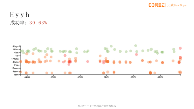 以上图为例,横轴是时间,纵轴是每一次发布的耗时。一个红点表示一次失败的发布,一个绿点表示一次成功的发布。图中该应用的发布成功率只有30%左右。