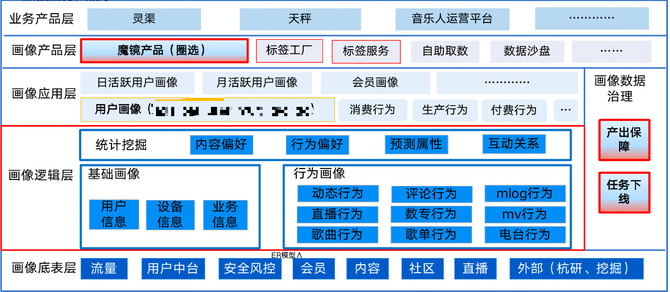 画像产品层是基于画像数据进行的画像产品,包括魔镜圈选产品,实现标签管理的标签工厂,实现标签服务化的标签服务能力等等。