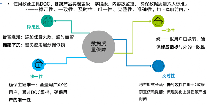 保障体系重点在于数据质量的监控保障,以数据稳定性、一致性、及时性、唯一性、完整性、准确性为核心保障内容,详细工具和方式见下图所示: