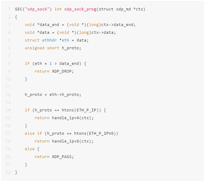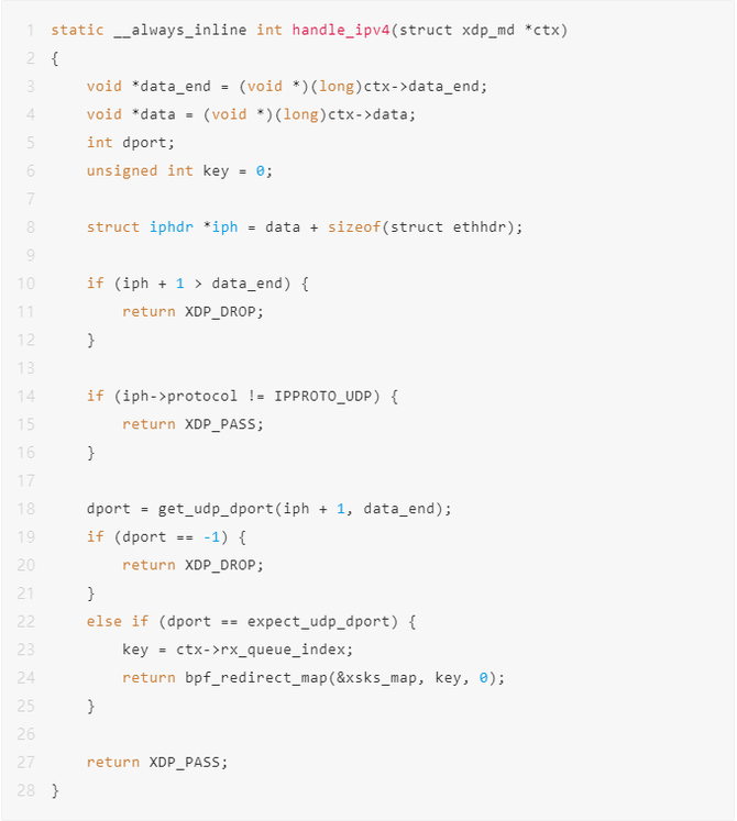上述代码片段是处理网络数据帧的主逻辑。根据TCP/IP协议分层体系,对数据帧进行解封装操作,检查数据帧的网络层协议,对于IPv4或IPv6数据方进行下一步处理,其他类型则返回XDP_PASS,这意味着非IPv4或IPv6的数据帧后续仍由内核协议栈进行处理。