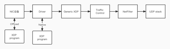 XDP有三种运行模式,分别是generic模式、native模式以及offload模式。其中native模式下,XDP程序挂载在驱动接收路径上,是最传统的XDP的模式,需要驱动的支持,目前主流的网卡驱动,如ixgbe,i40e等都已实现了native XDP;generic是内核模拟出来的一种通用模式,不需要驱动支持,但是XDP挂载点更靠后,在内核协议栈接受路径上,性能不如native;offload则是直接在网卡中对XDP程序进行处理,挂载点更靠前,是性能优秀的模式,但是需要硬件特别支持。