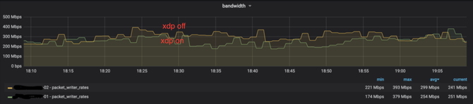 可以明显看到,使用AF_XDP,在同等CPU load的前提下可以服务更多的用户带宽。
