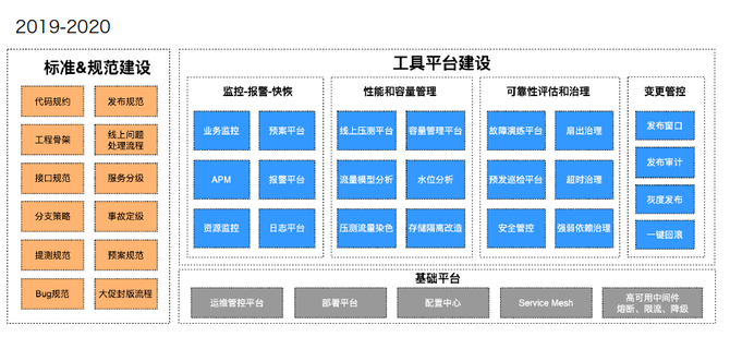 从2019年开始,严选频繁落实研发标准和规范,以及快速建设了一些工具和平台。在工具平台建设方面,主要包括四大部分,即监控-报警-快恢、性能和容量管理、可靠性评估和治理、变更管控。