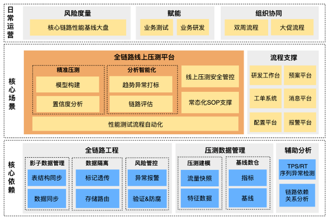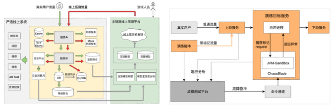 在性能、可靠性评估能力方面,下图左侧是生产环境全链路压测,导购交易链路,覆盖200+个线上应用集群,从2019年开始累积识别、修复风险点500+。
