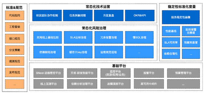 首先,风险难以充分识别,仅靠线上运维兜底是不行的,导致我们频繁救火、复盘;其次,需求迭代压力很大,投入不足,运动式治理、难以持续;最后,团队多、人员流转,导致标准混乱,依赖个人能力,人走政息、落地不易。