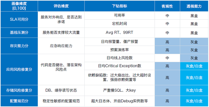 针对上述需求,严选推出全新的度量方式——服务稳定性画像。其设有六大评估维度,即SLA可用分、基线压测分、容灾能力分、应用风险修复分、存储风险修复分、配置规范分。据严选统计,事实指标占比80%+,灰盒/白盒指标占比70%。