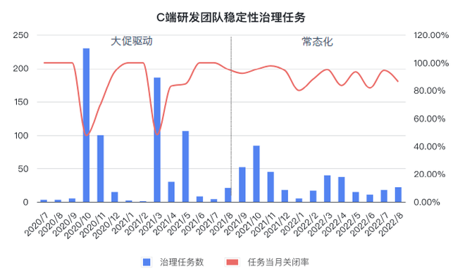 在C端研发团队稳定性治理任务上,严选治理事项当月完成率从过去最低50%,提升到85%以上,研发团队用于稳定性治理的总投入降低30%以上,严选正在从“大促+事故驱动”到“常态运营”转换,目前,严选已经连续20个月无稳定性事故。
