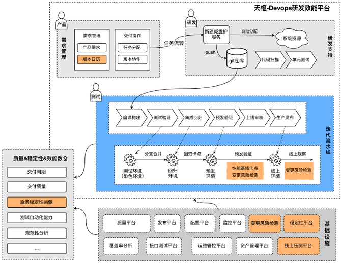 在产品方面有需求管理和交付协作,在研发方面有服务新建或维护、git仓库、代码扫描等等,在测试方面有编译构建、测试验证、集成回归、预发验证、上线审核和生产发布,在测试时有染色环境,集成回归时也有相应的回归环境,在预发和上线之前,我们会做性能基线卡点和变更风险监测。