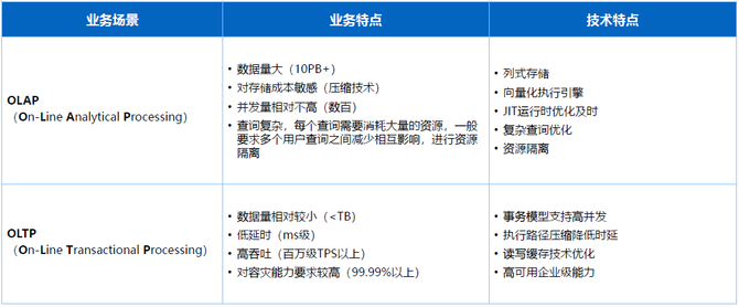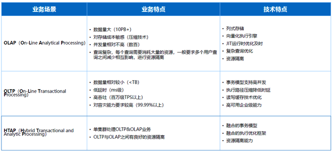 OLTP场景更多要求是在事务模型支持高并发,执行路径达到降低时延,读写缓存技术优化以及企业级高可用要求比较高,包括容灾场景针对性要求非常高。