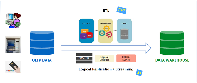 过去的十年更多推进的是基于Logical Decoder和Logical Replay去做基于流式复制更高时效的复制层面设计,通过CDC从远端TP场景抓取增量日志、逻辑日志,传输到端的数仓,再做一个日志回放,这样的话时效可以达到5秒内,目前国内的主流混合场景其实都可以通过流复制达到准实时或者基本近实时的效果。