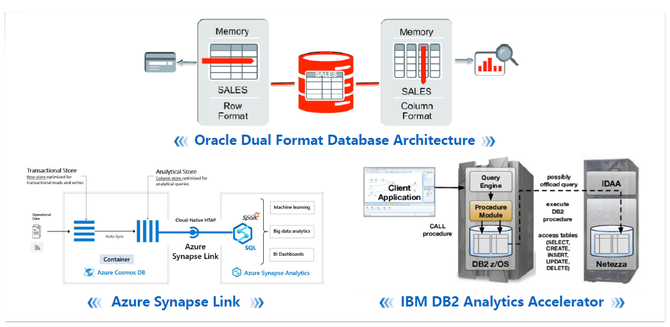 这里有些混合方案,比如行存和列存的构建格式,通过实时双模存储格式达到HTAP的整体要求,Azure Synapse和IBM DB2 Analytics Accelerator也是融合不同的TP和AP产品,无论是外部还是内部达到实时的数据复制,为用户提供一个基本透明的HTAP体验,这些都是传统厂商做的探索。