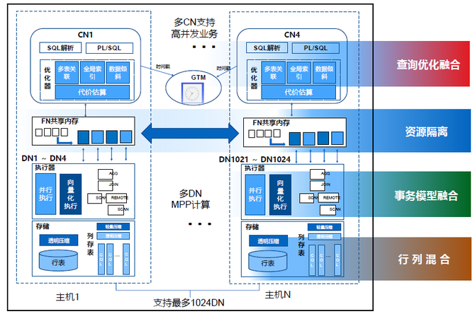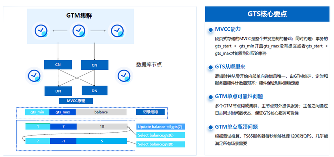 这里主要是通过基于一个单调递增的逻辑时间戳,以及基于时间戳的可能性判断的逻辑调整,GTS也是在GTM节点能做了很多并行生成优化,保证单台TS85服务器达到1200万QPS的请求服务标准,然后在这样的GTM底座下支持集群多节点的行列混合的事务模型基础。