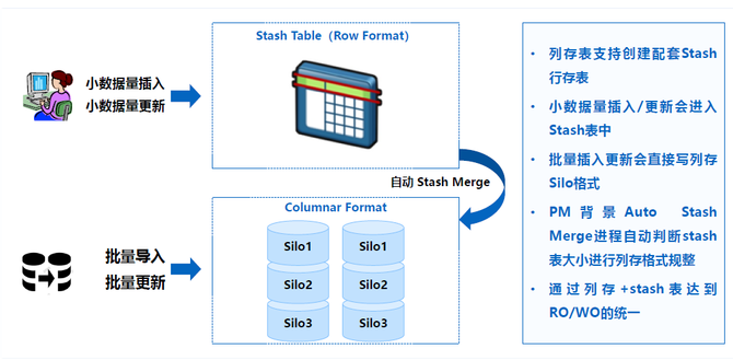 我们的做法是列存表格式下,用户可以选择一个开关建对应的行列混合的表,行存表部分其实就是内嵌一张辅助的行存表,存储相关的一些OLTP场景的数据,我们会自动地为用户进行区分,比如用户业务场景进来,就是小数据量的插入更新,可能会有一个阈值进行设置,会走入行存表Stash表里面,如果是批量导入和批量更新,这些数据会直接组织成列存格式,然后以最优的面向查询请求的方式去做数据编排。