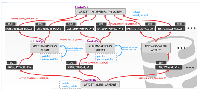 刚才讲的是存储和事务层面,产品优化也是做了统一的基于CBO和RBO的优化器,典型的动态规划算法。多表关联,每个Level开始规划单表的执行路径,可能的Table Scan还是Index Scan,尝试所有可能的多表关联、两表关联,生成相对应的路径,然后判断这一层的Cost,形成状态转一函数,完善多层的动态规划,寻找最优执行计划的方法。