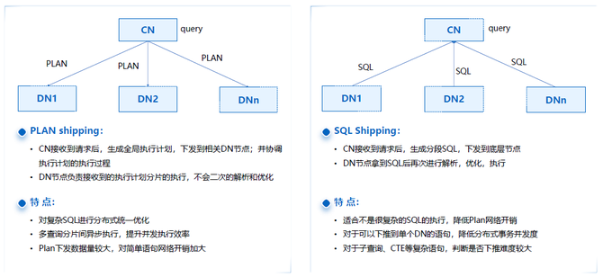 之前讲的是通用的查询优化,这里对OLTP场景也有一些针对性的优化。图中就是分布式场景下的两种层面:PLAN Shipping就是Query在CN节点进行统一场景分片规划,针对子的场景计划推到对应的计算节点进行执行计划,这样的好处就是对复杂SQL会有一个统一的CN节点去做评估、搜集和判断,多分片情况下,不同分片计划同时可以启动多个进程进行并行计算,不需要有些等待。