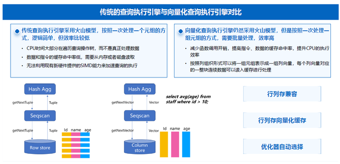 向量化引擎也会对行存表和列存表去做向量化执行:行存表会有一个算子做数据类型的转换,转换成内存格式计算,列存表本身是原生,就是向量化扫描的,内存执行效率会因为有向量化执行去做进一步的性能优化。