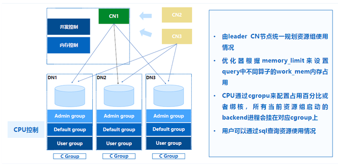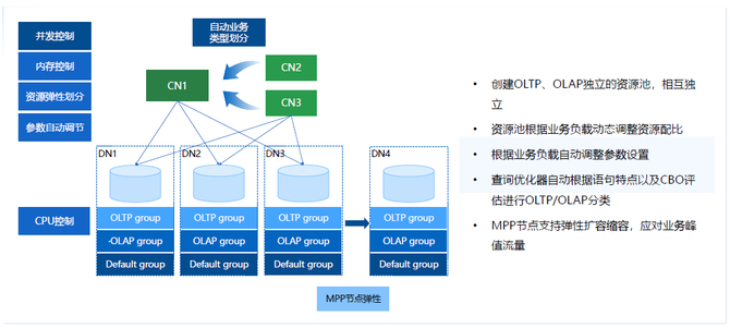 这里是通过CPU进行强隔离,内存是通过增强查询优化器动态规划,Query在每个算子到底需要多少内存,PLAN限定好对应算子的内存使用量,去做一个灵活的规划,保证不会超过资源组的资源限制,如果超过的话用户可以配置不同User里面的优先级去做任务调度的等待和任务插入的操作。通过这种层面,我们可以对TP、AP甚至AP场景下不同的用户组或者任务组去做隔离。