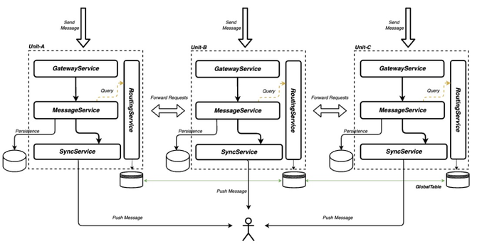 从上图可知,每次消息发送,都要查询路由服务,DTIM百万的峰值,对路由必然会带来超大的压力,同时我们能发现,路由数据在多单元实现一致性是一个巨大的挑战。