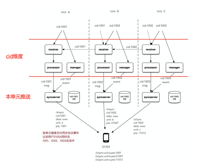 以IM为例,每次消息的发送,在单元化框架层面,会通过消息的会话(CID),查询路由信息,如果是本单元,流量下行并持久化;如果是非本单元,路由到对应的单元中。下图是三个会话,分别是cid:1001、cid:1002、cid:1003,三个会话隶属不同单元,不管用户从哪个单元发送消息,都会路由到会话所在的单元。比如用户在Unit B的cid:1001 中发送消息,当消息进入Receiver之后,会先查询此cid:1001所在的单元,发现是Unit A,路由框架将请求转到A单元,消息在A单元持久化并通过A单元的同步协议,将数据推送到客户端。