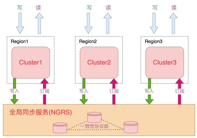 多地域(Region)数据同步其实是通用的技术挑战,我们认为存储系统提供是最好的方式,正如Google的Spanner一样,这样对我们上层才是最友好的方式。因此我们找到了存储的OTS、Nuwa团队一起共建了GlobalTable。GlobalTable的核心原理还是借助Nuwa的一致性组,组分布在多个地域,采用多数派写入成功即返回的原理,做到20ms以内的一致性写。