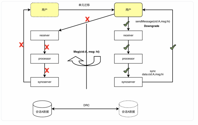 钉钉单元化的容灾能力是深度结合钉钉的业务层场景落地的,和淘系支付宝等有明确的区别。以DTIM为例,最大的特点是当服务单元异常时,服务侧仍能提供最核心的服务,保障最基本的能力。本质上是由于DTIM是最终一致性系统,可以短暂允许部分环节失败。可以看一下DTIM发送消息的容灾场景。当某个单元完全不可用的情况下,用户消息发送链路通过降级为local模式,在本地校验非本单元会话数据通过之后直接做消息发送,processor遇到非本单元的会话消息数据可以做单元间投递做数据回放,本地是否落库可选,同步协议推送不必区分是否为本单元会话消息数据直接通过本单元的topic推送给客户端,配合用户无状态快速迁移能力,单元间可以实现真正的分钟级别容灾切换能力。