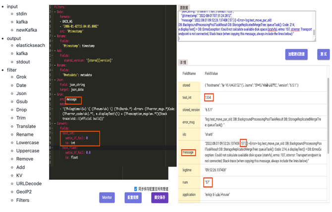 GoHangout 是仿照 Logstash 做的一个开源应用(Github链接),用于把数据从 Kafka 消费并进行 ETL,最终输出到不同的存储介质(Clickhouse、ElasticSearch)。其中数据处理 Filter 模块包含了常见的 Json 处理、Grok 正则匹配和时间转换等一系列的数据清理功能(如图6)。GoHangout 会将数据 Message 字段中的 num 数据用正则匹配的方式提取成单独字段。