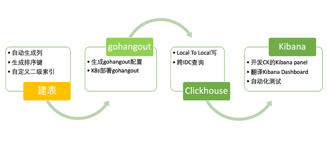 有了存储引擎后,我们需要实现对用户无感知的存储迁移。这主要涉及了以下的工作内容(如图12):自动化建表、GoHangout 修改、Clickhouse 架构设计部署和 Kibana 改造。