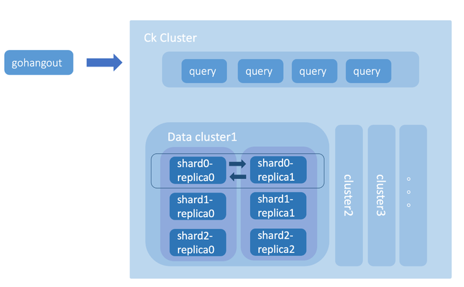 Clickhouse 集群主要由查询集群、多个数据集群和 Zookeeper 集群组成(如图14)。查询集群由相互独立的节点组成,节点不存储数据是无状态的。数据集群则由Shard组成,每个 Shard 又涵盖了多个副本 Replica。副本之间是主主的关系(不同于常见的主从关系),两个副本都可以用于数据写入,互相同步数据。而副本之间的元数据一致性则有 Zookeeper 集群负责管理。
