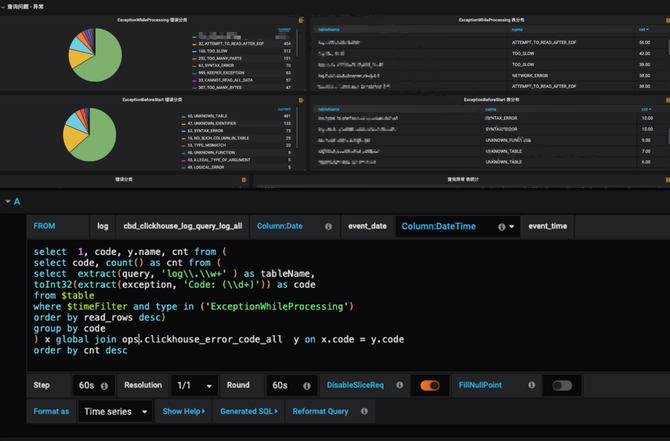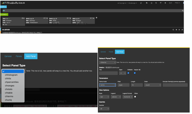为了实现用户无感知的存储切换,我们专门实现了 Kibana 对 Clickhouse 数据源的适配并开发了不同的数据 panel(如图15),包括:chhistogram、chhits、chpercentiles、chranges、chstats、chtable、chterms 和 chuniq。通过 Dashboard 脚本批量生产替代的方式,我们快速地实现了原先 ElasticSearch 的 Dashboard 的迁移,其自动化程度达到95%。同时,我们也支持了使用 Grafana 的方式直接配置 SQL 来生成日志看板。