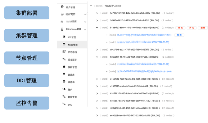 为了更好地管理 Clickhouse 集群,我们也做了一整套界面化的 Clickhouse 运维管理平台。该平台覆盖了日常的 shard 管理、节点生成、绑定/解绑、权重修改、DDL 管理和监控告警等治理工具(如图16)。