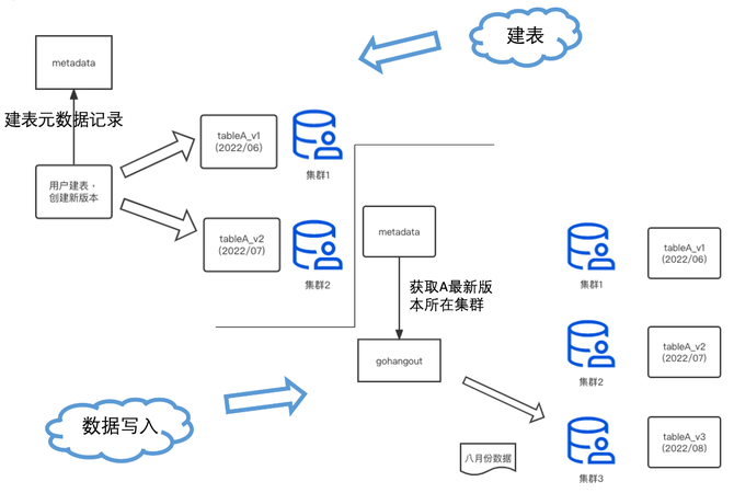 同时,这种多版本集群的方式,也能方便地实现集群升级迭代,如直接新建一个集群4来存储所有的09月的表数据。集群4可以是社区最新版本,通过这种迭代的方式逐步实现全部集群的升级。