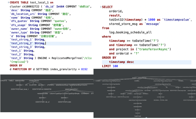 在查询层,我们基于 Antlr4 技术,将用户的查询 SQL 解析成 AST 树。通过 AST 树,我们能够快速地获得 SQL 的表名、过滤条件、聚合维度等(如图20)。我们拿到这些信息后,能够非常方便地对 SQL 实时针对性的策略,如:数据统计、优化改写和治理限流等。