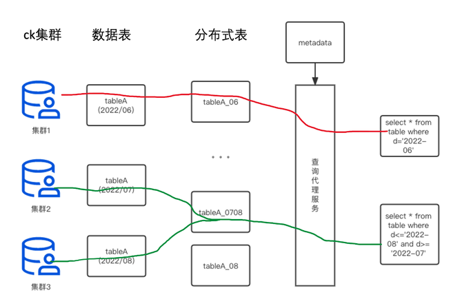 于是,我们设计一套类分库分表的架构,来实现表A在多个集群1、2、3之间来回穿梭。我们可以看到右边改造后,表A以时间节点作为分库分表的切换点(这个时间可以是精确到秒,为了好理解,我们这里以月来举例)。我们将6月份的数据写入到集群1、7月写到集群2、8月写到集群3。当查询语句命中6月份数据时,我们只查询集群1的数据;当查询语句命中7月和8月的数据,我们就同时查询集群2和集群3的数据。